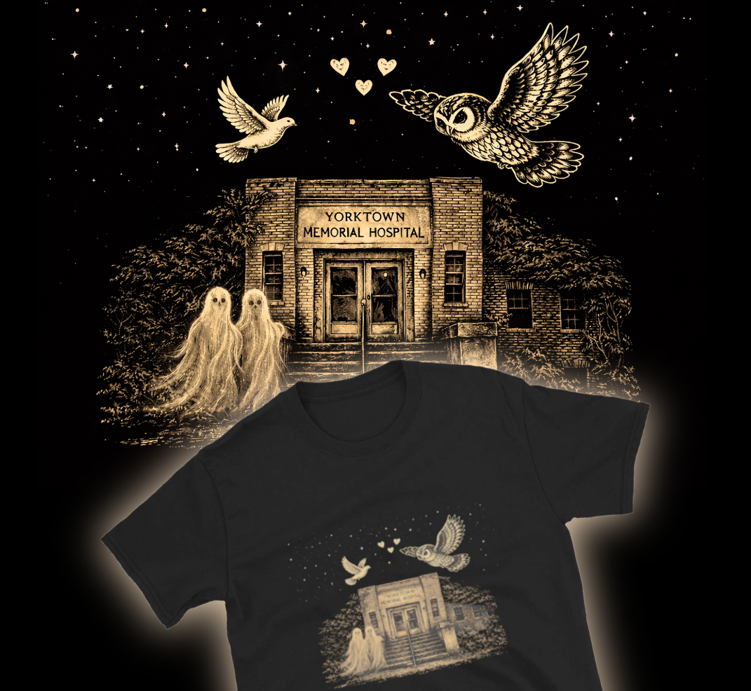 Wear a piece of Texas legend this Valentine’s Day. The Yorktown Memorial Hospital stands as a silent witness to decades of history, and this year, we’ve reimagined its haunting beauty through a romantic, vintage lens. This limited edition t-shirt features an intricate illustration of the iconic facade under a starlit sky, guarded by a pair of spectral figures and the watchful eyes of an owl and dove. It is a wearable tribute to the spirits of the past and a love that lingers long after the lights go out.