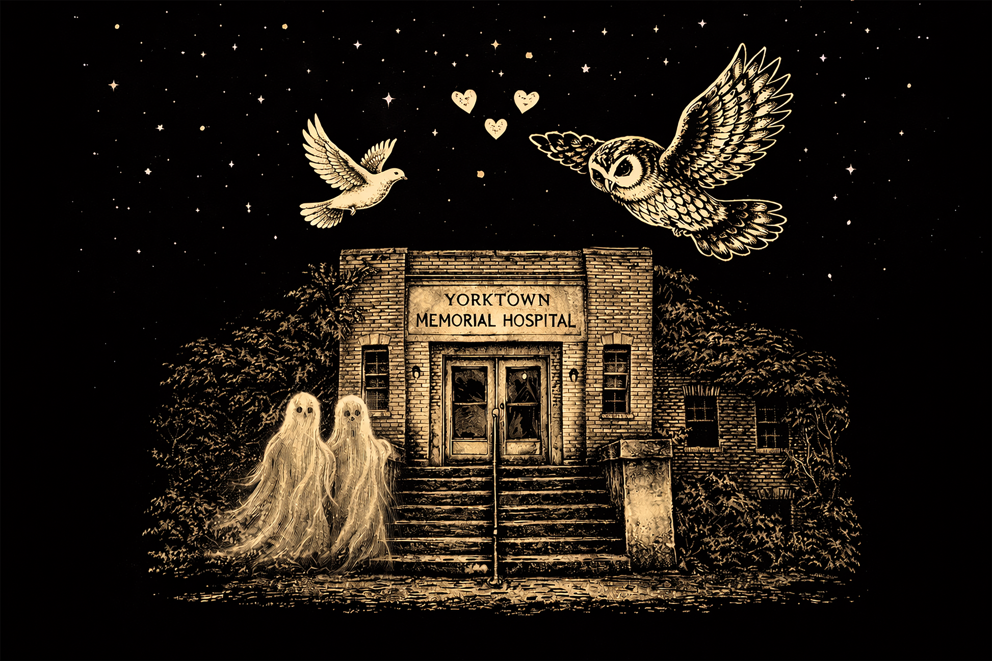 Wrap yourself in the mystery of Yorktown. As the nights grow cool, there is no better way to honor Texas history than with our limited edition Valentine’s hoodie. This design brings the haunting beauty of Yorktown Memorial Hospital to life, featuring the iconic facade under a canopy of stars. With spectral figures, the watchful owl, and the soaring dove, this artwork tells a story of love and legends that have endured through the decades.